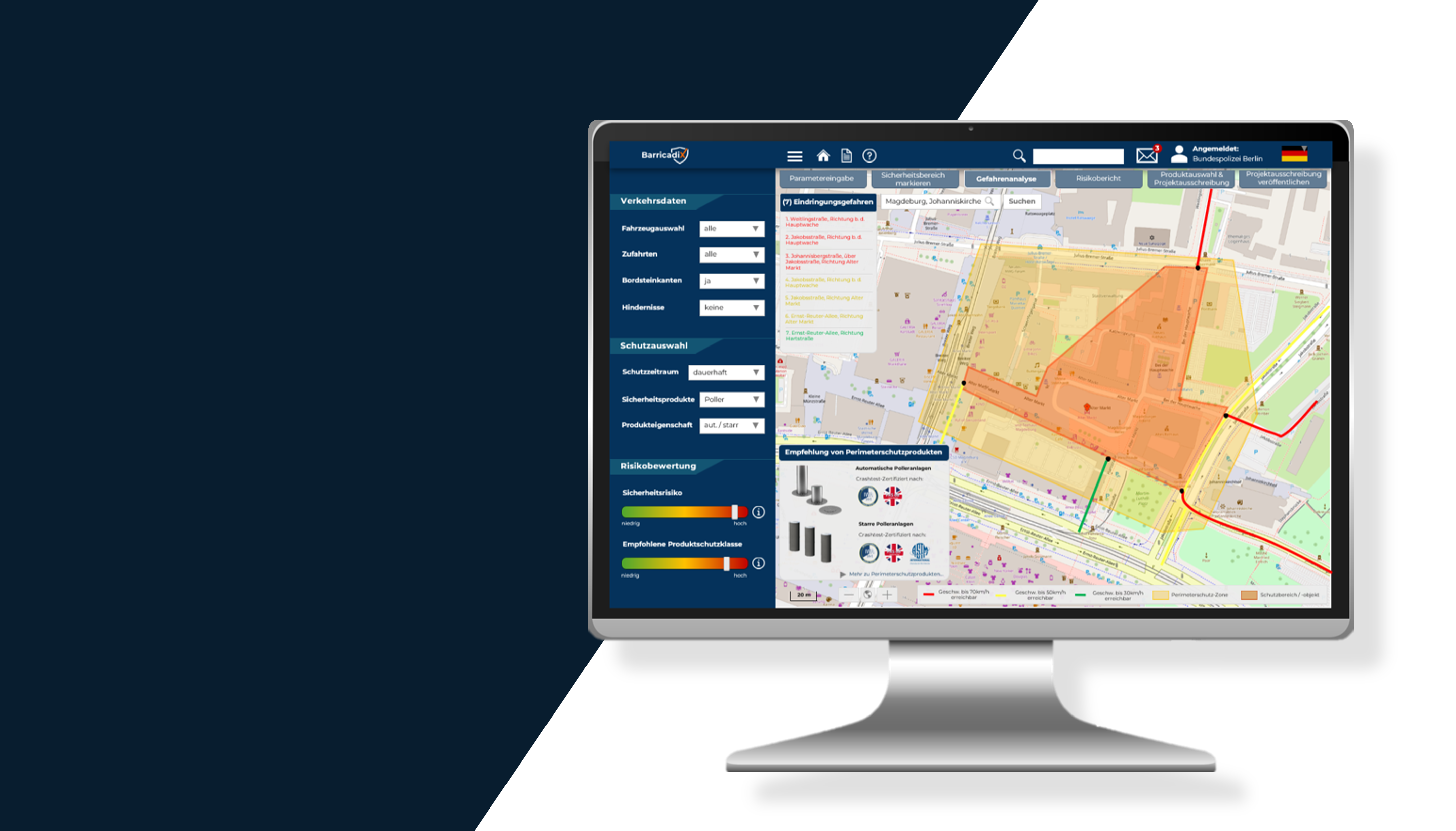 Vom kartenbasierten Markieren des Sicherheitsbereichs über die parametrisierte Zufahrtsanalyse und Geschwindigkeitsermittlung bis hin zu prüffähigem Risikobericht, GAEB-Ausschreibungen sowie norm- und risikobasierten Produktempfehlungen – alles in einem durchgängigen Workflow.
